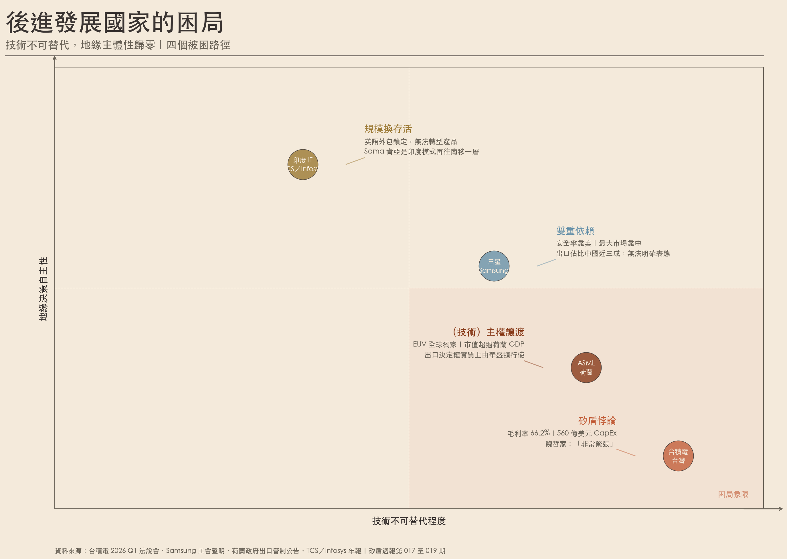 圖三:四個技術先行的案例。橫軸是技術不可替代程度,縱軸是地緣決策自主性。台積電(矽盾悖論)、三星(雙重依賴)、ASML(技術主權讓渡)、印度 IT(規模換存活)落在相近的象限,但被困住的路徑各異。