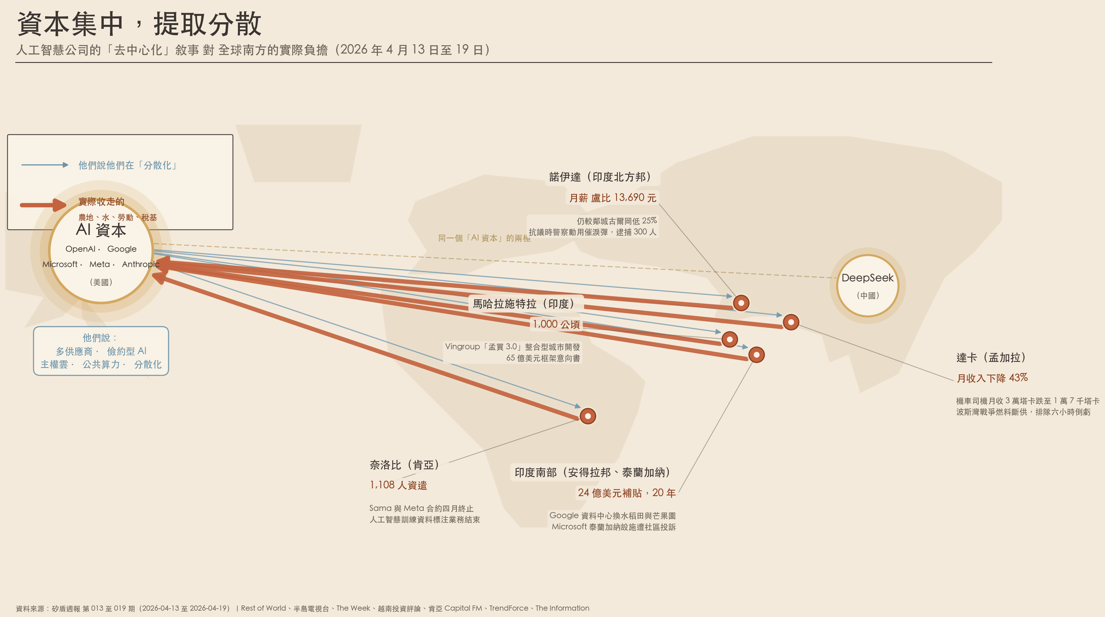 Google 在安得拉邦拿到 24 億補貼,被「去中心化到全球南方」的是北美過度集中的資料中心,但帶走的是當地農民的農地、水資源、以及二十年的地方稅基。印度人權論壇警告項目威脅當地的水稻田和芒果園。Microsoft 在泰蘭加納的類似設施,自 2024 年起已被投訴「侵佔和工業廢棄物傾倒」。