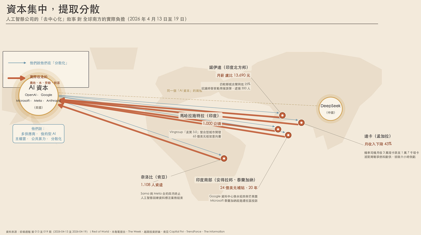 圖一:細粉藍箭頭是 AI 公司的公關語言(多供應商、儉約型 AI、主權雲、公共算力、分散化)向全球南方發射;粗鏽紅箭頭是實際的提取(農地、水、勞動、稅基、健康)回流到中心。