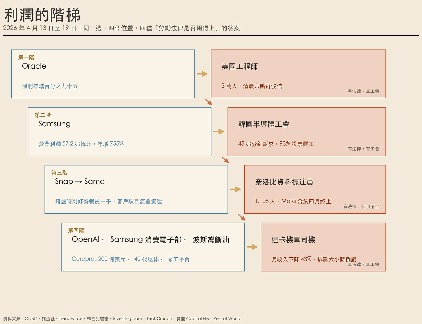 第二階:Samsung。韓國首爾,四月十日到十五日工會投票,93% 支持從五月二十一日起十八天全面罷工。訴求是 45 兆韓元分紅,相當於單季利潤的 78%。Samsung 第一季營業利潤 57.2 兆韓元,年增 755%,史上最高。四月十六日(同一天,台積電法說會的同一天),Samsung 向水原地方法院申請禁制令,企圖阻擋罷工。**有工會的地方,利潤爆發變成分配爭議。**